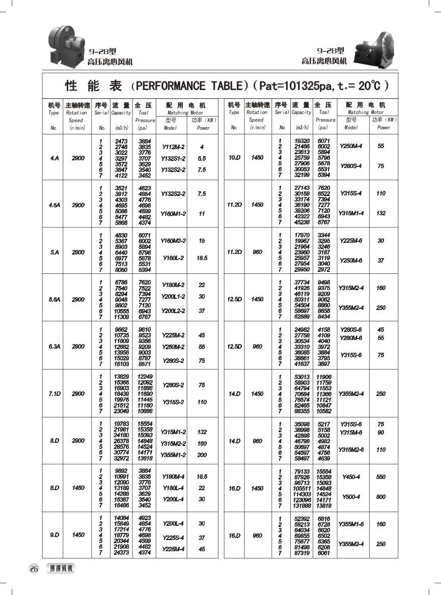 本公司生產(chǎn)的高壓離心 風(fēng)機(jī)有8-09型、9-12型 9-19型,9-20型、9-26型 9-28型、10-16型、10-24 型等型號。